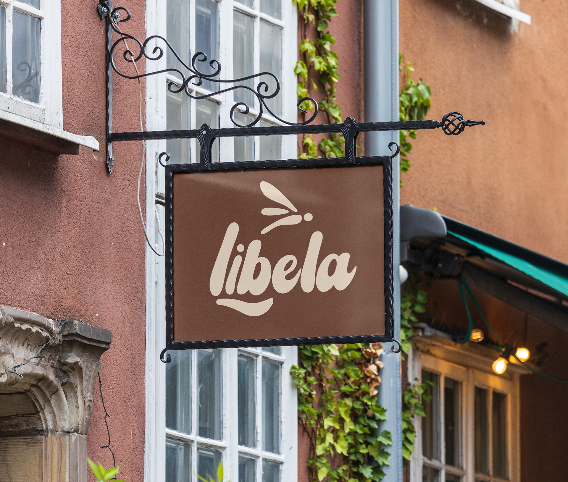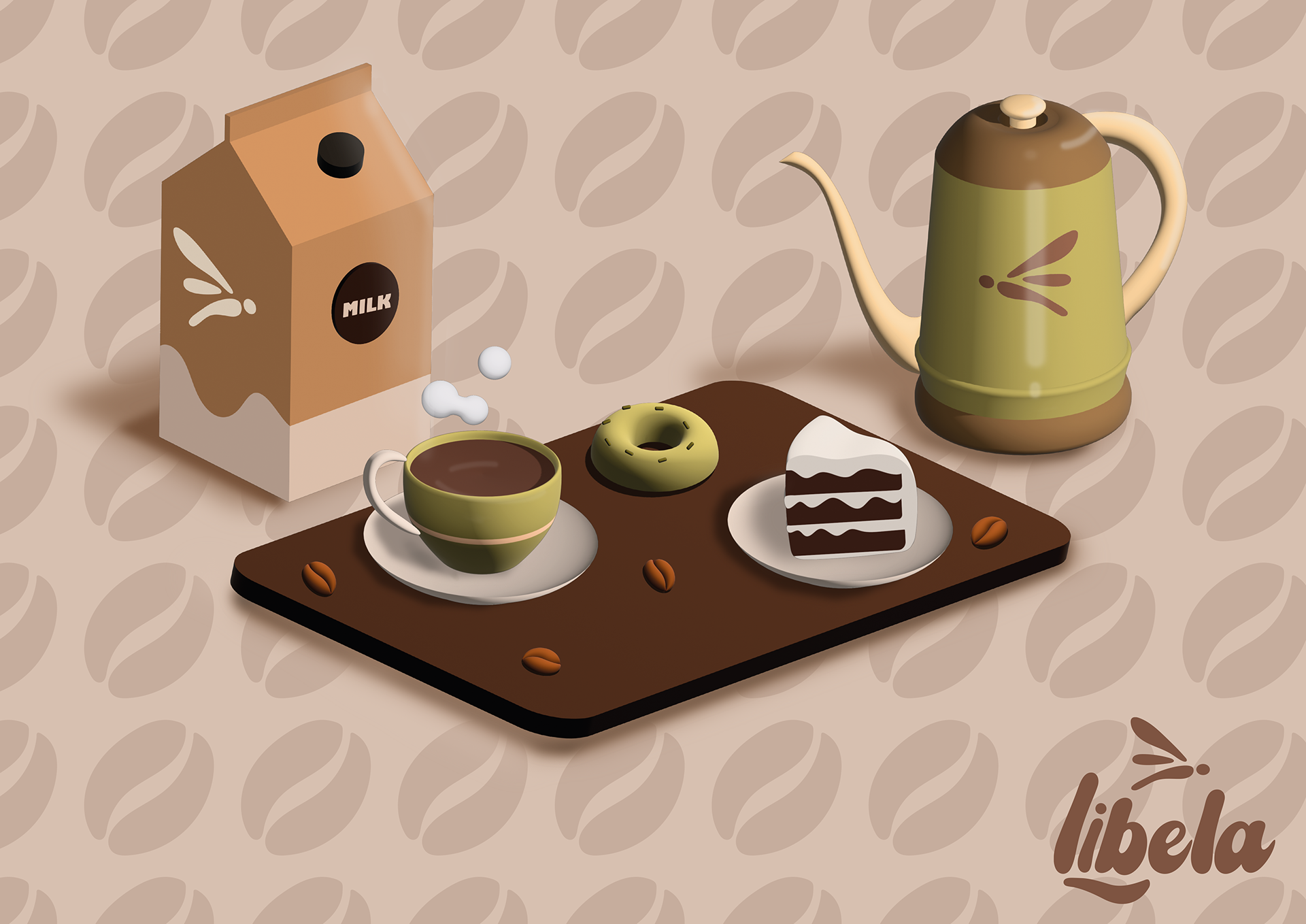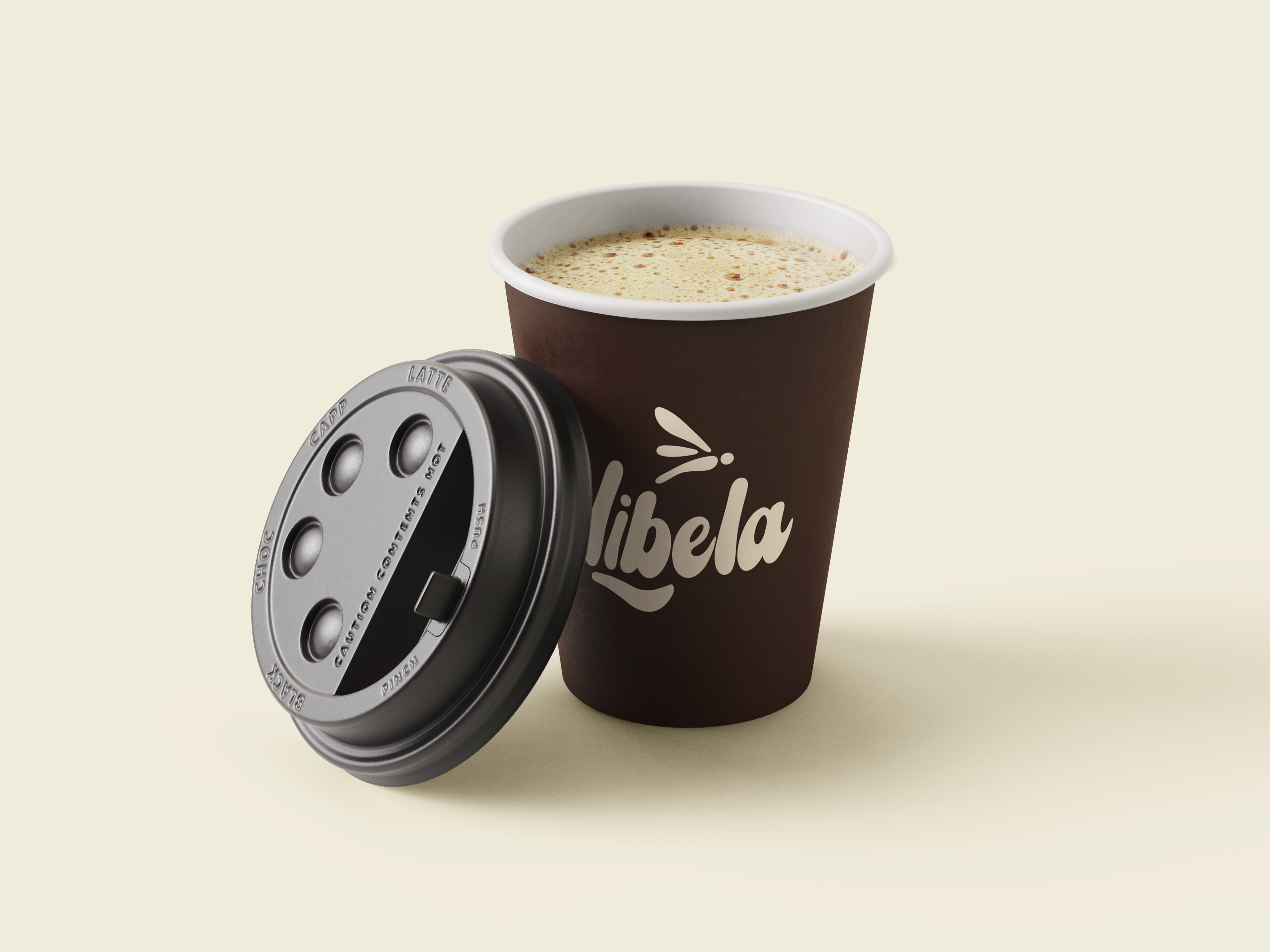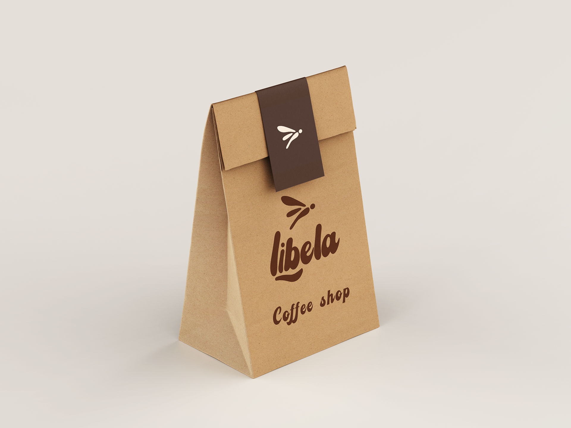 Création d'une marque fictive de café. Couleurs chaudes pour rappeler le grain de café, le symbole de la libellule pour l'élégance et la finesse du café.